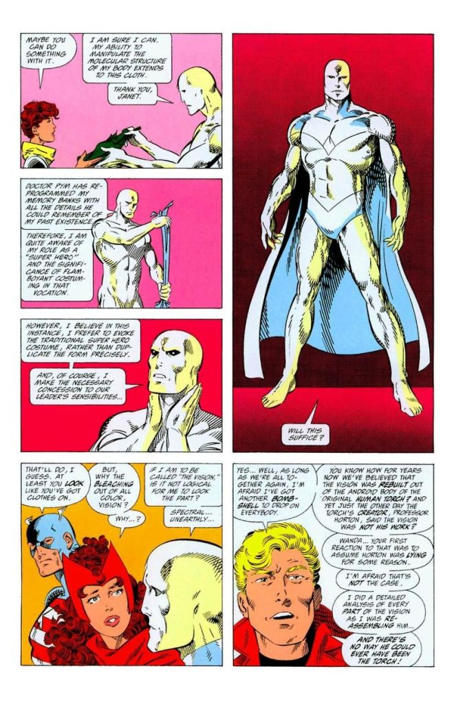 E vem a conexão com A Busca pelo Visão: Vision’s Quest é um arco de histórias dos Vingadores da Costa Oeste, uma subdivisão do time principal que surgiu nos anos 1980. Na trama escrita e desenhada por John Byrne e publicada entre Avengers West Coast 42 a 46, de 1989, o Governo dos EUA sequestra o Visão para desmontá-lo e apagar suas memórias, em represália a um ato mostrado em revistas anteriores na qual o androide tentou se conectar a todos os computadores do mundo (não existia internet nos anos 1980…) para garantir a paz.