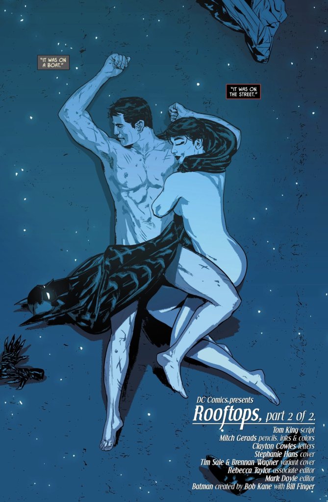 Batman/ Mulher-Gato terá desenhos de Clay Mann e três imagens promocionais foram divulgadas: o casal abraçado, os dois se balançando entre prédios e uma outra em que ambos estão sobre uma gárgula no topo de um edifício e Selina Kyle está grávida. Algo que é referente ao presente ou ao futuro?