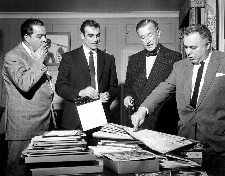 Broccoli, Connery, Fleming e Saltzman discutem sobre um monte de papeis, mapas e arquivos.