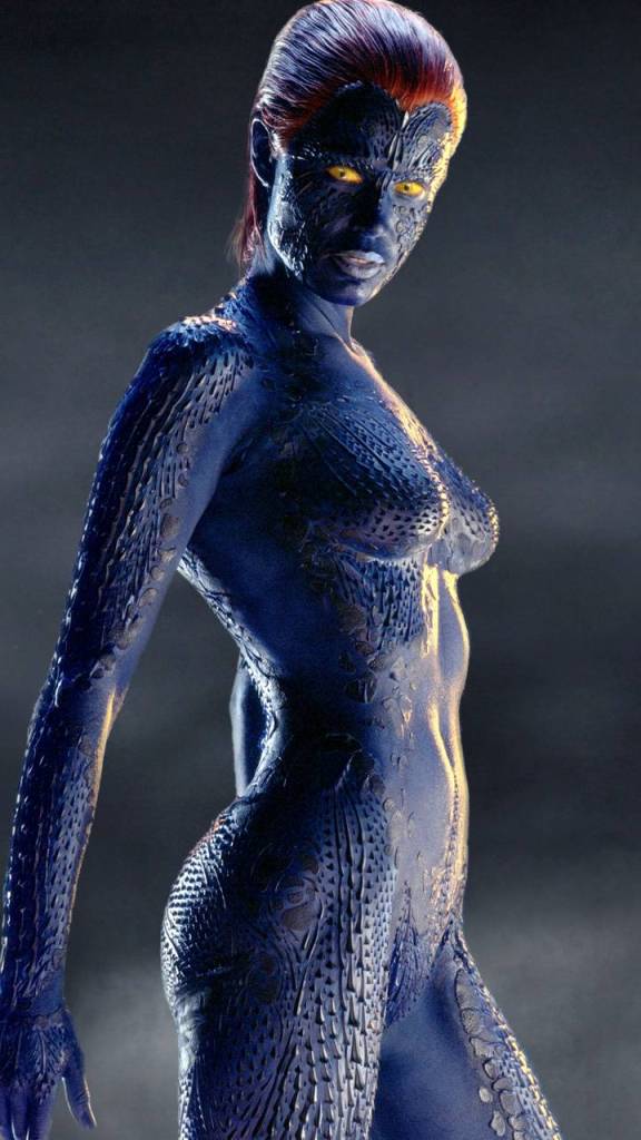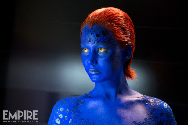 Outro elemento da ascensão da atriz foi que tanto em Dias… quanto em Apocalipse, Mística aparece o mínimo possível em sua versão azul, para evitar Lawrence do transtorno de passar horas sendo maquiada. Isso também levou ao desenvolvimento de uma técnica mais simples de transformá-la, usando apliques de silicone e um tipo de pancake azul.