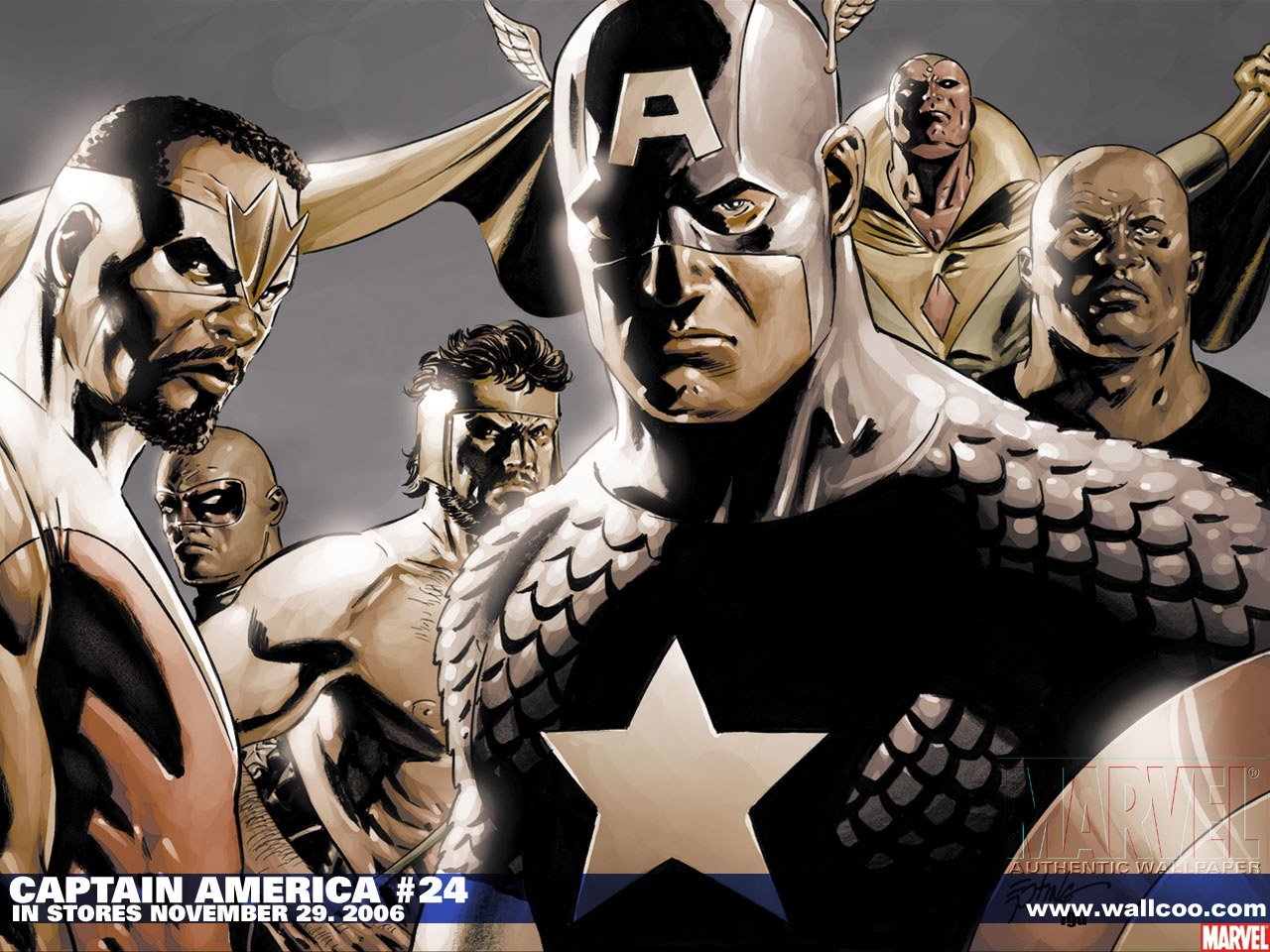 O Falcão (esq.) e o elenco de apoio do Capitão América de Brubaker e Epting.