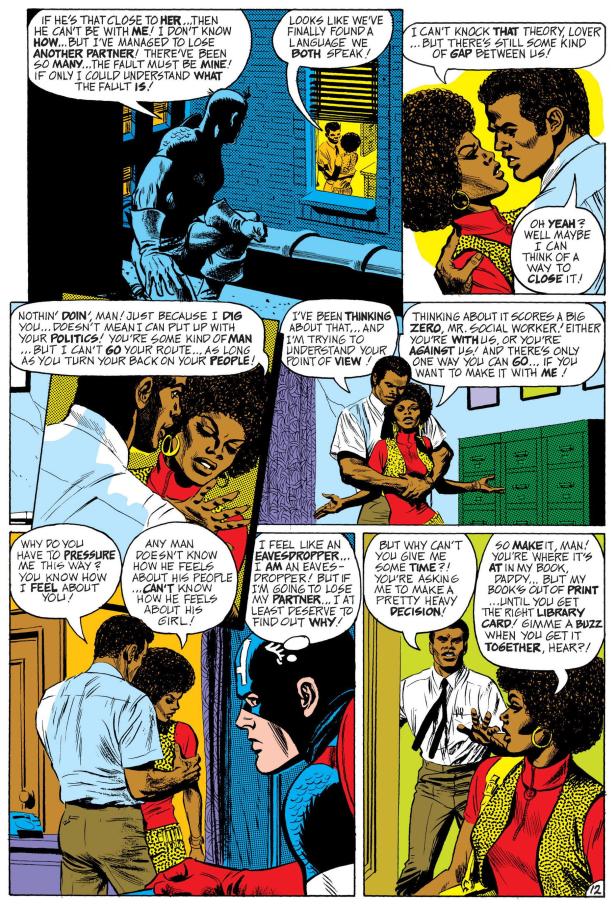 A relação entre Sam Wilson e Leila Taylor foi usada para problematizar as questões raciais dos EUA dos anos 1970. Arte de John Romita.