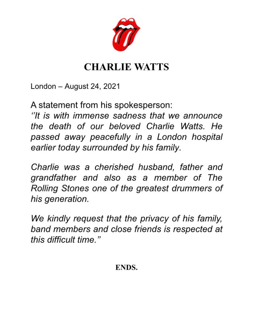 Com muita tristeza, foi confirmado pelas redes sociais oficiais dos Rolling Stones a morte do baterista Charlie Watts, de 80 anos. Recentemente, havia sido anunciado o afastamento temporário de Watts para a próxima turnê do grupo pelos EUA, por causa de um procedimento de saúde não especificado ao qual seus médicos recomendaram um período de recuperação maior. Mas o comunicado dos Stones anuncia que o músico faleceu na manhã de hoje, em um hospital de Londres.