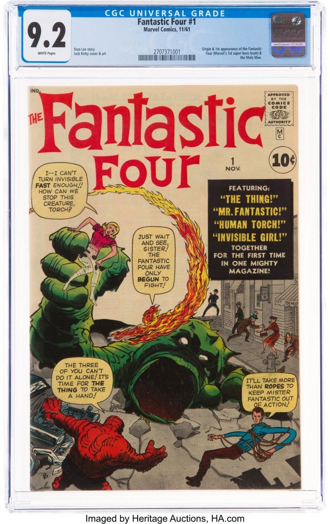 E a festa para as artes de Jack Kirby não terminaram aí. Outra revista assinada pelo “Rei dos Quadrinhos” também bateu recordes: Fantastic Four 01 de novembro de 1961, e assinada ao lado de Stan Lee, foi vendida por 1,5 milhões de dólares, numa cópia em ótimo estado de conservação e CGC de 9,2.