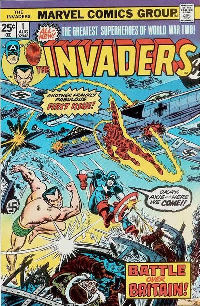 Os Invasores foi uma criação retroativa de Roy Thomas durante sua passagem nos Vingadores, criando a ideia de que o Capitão América, Namor, o príncipe submarino e o Tocha Humana original tinham atuado juntos na II Guerra Mundial contra os Nazistas. O trio de personagens eram os mais populares da Marvel nos anos 1940, mas tinham histórias separadas, embora aparecessem unidos em algumas capas (mas apenas nas capas) sugerindo o conceito aos leitores. Após o fim da guerra duas histórias de 1946 mostraram realmente um grupo com esses heróis, chamados Esquadrão Vitorioso, mas eles não apareceram mais depois disso.