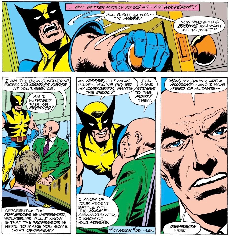 Então, Len e eu meio que aceitamos aquilo [o visual de Wolverine por Romita] e eu passei para Len e nunca mais pensei sobre isso de novo. Sabe, eu meio que vagamente aprovei a história quando ela chegou, mas fora isso, era só mais outro personagem. Então, agora tínhamos nosso personagem canadense e fizemos um par de anúncios na revista, destacando o fato de que tínhamos o primeiro super-herói canadense nos Estados Unidos. [Wolverine estreou em The Incredible Hulk 180, de 1974, com roteiro de Wein, arte de Herb Trimpe e capa de John Romita]. Ademais, eu deixei para Len, que fez um bom trabalho. E então, claro, levou alguns anos até Len decidir colocá-lo nos X-Men, logo depois que eu deixei meu cargo de editor-chefe. Eu tinha sugerido trazer os X-Men de volta com um novo time internacional e ele [Wein] usou meus três personagens [os estrangeiros: Banshee, Solaris e Wolverine] em Giant-Size X-Men, meus três personagens estrangeiros junto a alguns novos que ele e Dave Cockrum fizeram.
