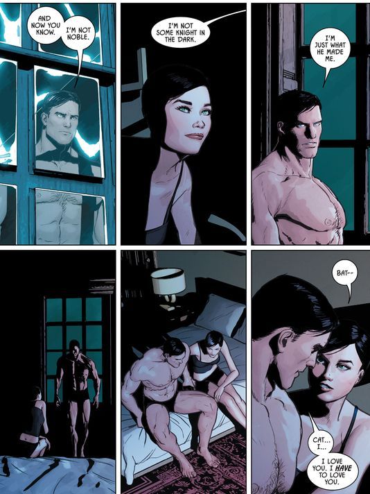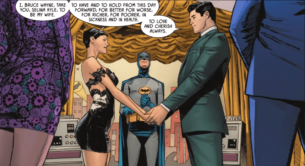 Tom King levou isso ao ponto final: com a relação sólida e madura, Bruce pediu Selina em casamento e o enlace ficou agendado para Batman 50, de 2018, contudo, na trama, nos pés do altar, a Mulher-Gato dá para trás e o casamento não se consuma, com a história mostrando que isso não aconteceu por causa de uma manipulação do vilão Bane com a irmã adotiva de Selina, Holly Robinson.
