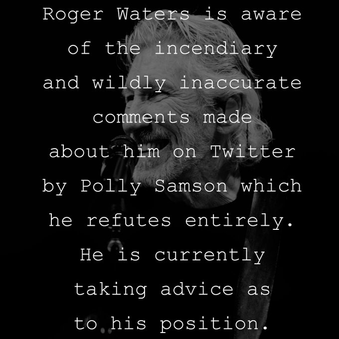 Roger Waters está ciente das incendiárias e horrivelmente inacuradas escritas no Twitter por Polly Samson, o que ele refuta inteiramente. Ele está neste momento tomando conselhos sobre sua posição.