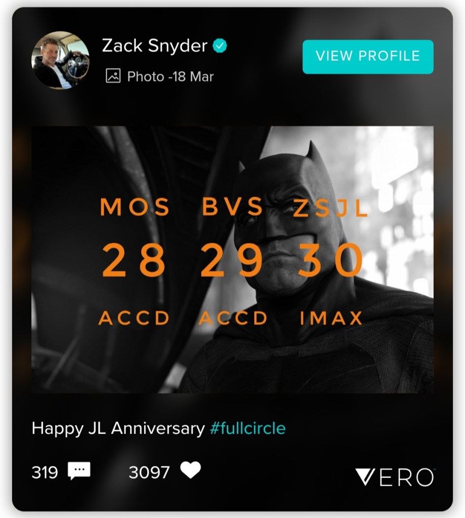 Já há alguns dias, o diretor Zack Snyder vem provocando os fãs com algo relacionado a Liga da Justiça de Zack Snyder, a edição do diretor só filme que fora originalmente lançado em 2017 após ele ser demitido da produção. Snyder anunciou um evento misterioso nos dias 28, 29 e 30 de abril e na nova postagem deixou claro que será a exibição de sua trilogia da DC Comics nos cinemas, com Superman – O Homem de Aço (2013), Batman vs Superman – A Origem da Justiça (2016) e Liga da Justiça de Zack Snyder (2021), como diferencial de que esse último sairá não só pela primeira vez nos cinemas, mas também em formato Imax.