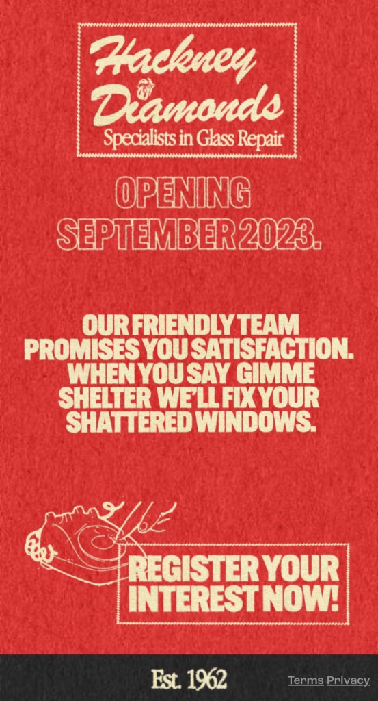 No anúncio vemos a referência a uma pretensa empresa chamada Hackney Diamonds, “especialistas em vidros quebrados”, com fundação em 1962, ano de formação do grupo. O texto faz referência a três canções da banda e como se as pistas ainda não fossem o suficiente, a logomarca da boca com língua aparece no topo!