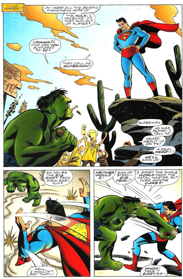 Ainda que não estejam presentes todos os crossovers entre as duas editoras, o volume traz pelo menos os mais célebres, com uma exceção célebre da qual falaremos a seguir. Mas aqui há Superman vs. The Amazing Spider-Man, que foi o primeiro de todos esses crossovers, um megaevento lançado em 1976, com roteiro de Gerry Conway e arte de Ross Andru, além de colaborações de John Romita e Neal Adams, bem como a interessante Batman/Captain America, escrita e desenhada por John Byrne, que situa o encontro desses dois heróis nos tempos da II Guerra Mundial, ou o interessantíssimo encontro entre os X-Men e Novos Titãs, escrito por Chris Claremont e desenhado por Walt Simonson, talvez, a mais artística e inteligente dentre todas essas histórias, sem esquecer da saborosa Incredible Hulk vs. Superman, escrita por Roger Stern e desenhada por Steve Rude, com seu ar nostálgico e roteiro inteligente.