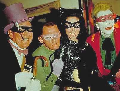 - Batman. Série de TV (3 temporadas – 1966-1968). Filme em Longametragem (1966, 104 minutos). Produção de William Dozier e roteiro por Lorenzo Semple Jr., Stanley Ralph Ross, Standford Sherman e Charles Hoffman Bill Finger, e outros. (Filme dirigido por Leslie H. Martinson, com roteiro de Lorenzo Semple Jr.). Elenco: Adam West (Bruce Wayne/ Batman), Burt Ward (Robin), Cesar Romero (Coringa), Burguess Meredith (Pinguim), Julie Newmar (Mulher-Gato), Frank Gorshin (Charada), Alan Napier (Alfred), Neil Harrison (Comissário Gordon), Sttadford Repp (Chefe O’Hara), Madge Blake (tia Harriet), Lee Meriweather (Mulher-Gato – apenas no filme), Ertha Kitt (Mulher-Gato – 3ª temporada), Yvonne Craig (Barbara Gordon/ Batgirl – 3ª temporada). 120 episódios, 3 temporadas.