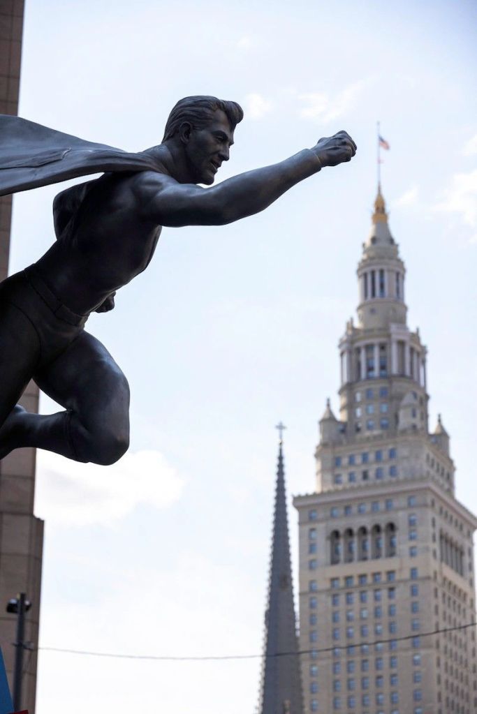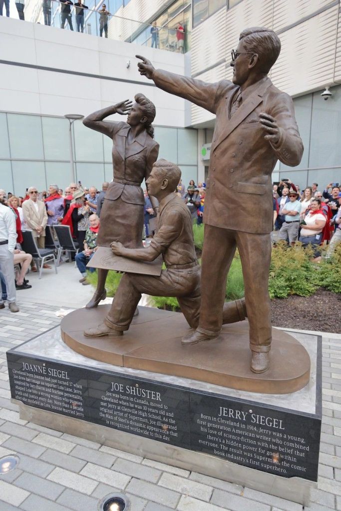 O conjunto de estátuas é uma iniciativa da The Jerry Siegel and Joe Shuster Society (associação que cuida da memória dos artistas) e do Comitê de Arte da cidade. A peça custou US$ 2,2 milhões, que foram arrecadados por meio de doações à Society. Batizada de The Superman Tribute Plaza, a intervenção traz uma estátua de três metros do homem de aço “voando” sobre um pedestal de seis metros de altura, assistido pelos criadores Siegel e Shuster e a esposa do primeiro, Joanne Carter, modelo que foi a inspiração para Lois Lane, contendo ainda uma cabine telefônica com as roupas largadas de Clark Kent e placas de sinalização com informações sobre o personageme suas origens, fica defronte o Huntington Convention Center, na esquina da Ontario Street com St. Clair Avenue, no centro da cidade.