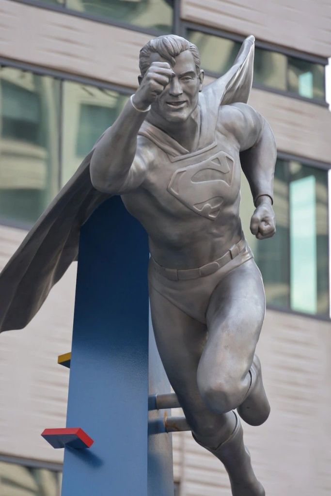 O artista ainda optou por outra coisa incomum: em vez do tradicional bronze, a estátua foi modelada em aço afinal, Clark Kent é “o homem de aço”.