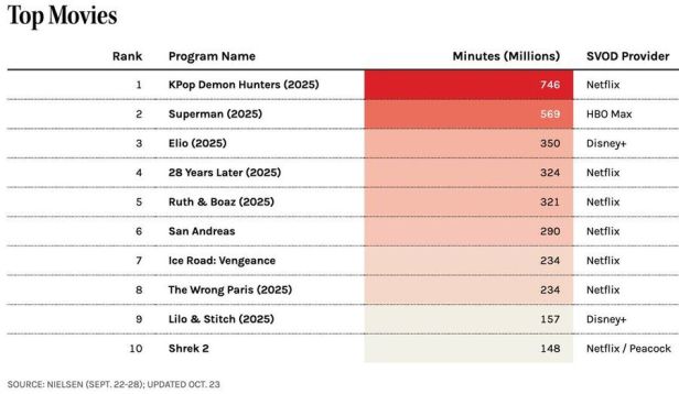 Vamos começar pelas boas notícias… A Nielsen’s é uma empresa que mede a audiência de programas de TV nos EUA, e hoje em dia, abarca também a categoria de streamings. E a medida desta semana, entre todos os filmes disponíveis em canais de streaming, Superman, escrito e dirigido por James Gunn, ficou em 2º lugar!!! Com 569 milhões de minutos (pois este é o indicador usado), atrás apenas de KPop Demon Hunters, que teve 746 milhões de minutos, ambos bem à frente do terceiro lugar, Elio, com 350.