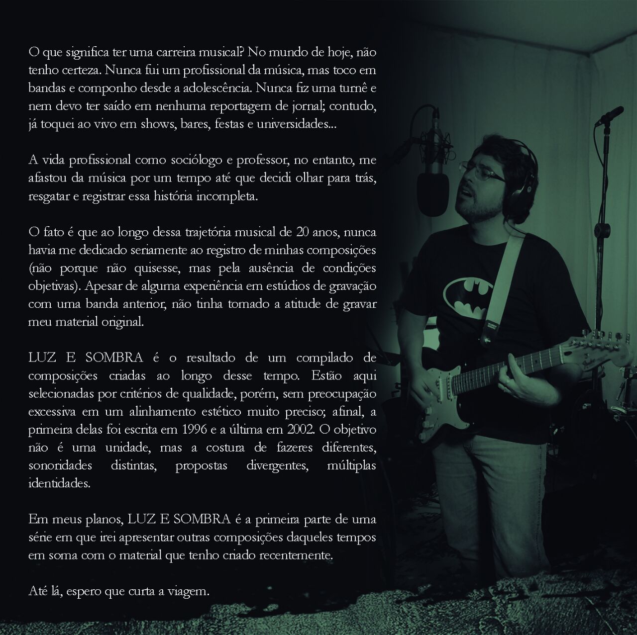 LUZ E SOMBRA é o resultado de um compilado de composições criadas ao longo desse tempo. Estão aqui selecionadas por critérios de qualidade, porém, sem preocupação excessiva em um alinhamento estético muito preciso; afinal, a primeira delas foi escrita em 1996 e a última em 2002. O objetivo não é uma unidade, mas a costura de fazeres diferentes, sonoridades distintas, propostas divergentes, múltiplas identidades.