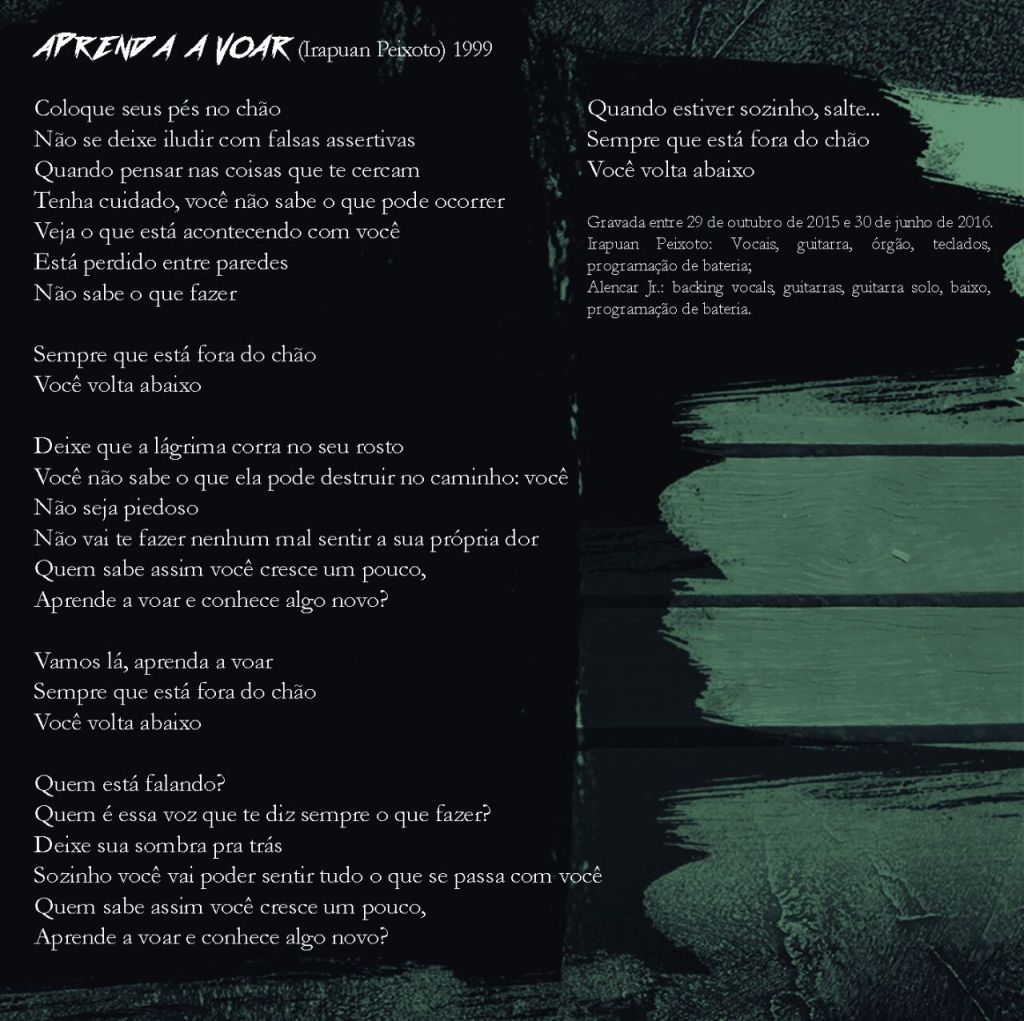 Às vezes caímos, mas precisamos nos reerguer. É sobre isso que fala Aprenda a voar, embora tomada de uma visão cínica e pessimista. A ideia sempre foi fazê-la como um rock bem direto, no estilo hardcore. Há uma coisa curiosa sobre esta canção: sempre gostei dela e achava que tinha potencial para ser um destaque, mas tentei incorporá-la ao repertório tanto da Jeannie Gen quanto da Suaves na Máquina sem sucesso, sem que causasse interesse. Durante a gravação deste disco, Aprenda a voar emergiu como a melhor candidata a um single de apresentação. O que isso quer dizer?
