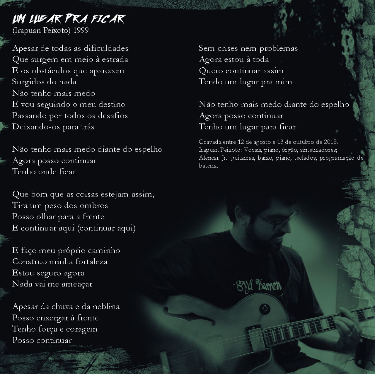 Embora geralmente tenham climas sombrios e entristecidos, minhas canções por vezes são um pouco mais luminares, e este é um desses casos. Na aurora do relacionamento com minha esposa Danyelle Nilin, fui iluminado com esta canção, que nasceu como de encanto, numa sentada só. A letra fala sobre encontrar o seu lugar na vida, apesar dos obstáculos e é uma mensagem positiva que mantenho comigo. Acho esta uma das melhores faixas do disco e é um filhote muito, muito querido.