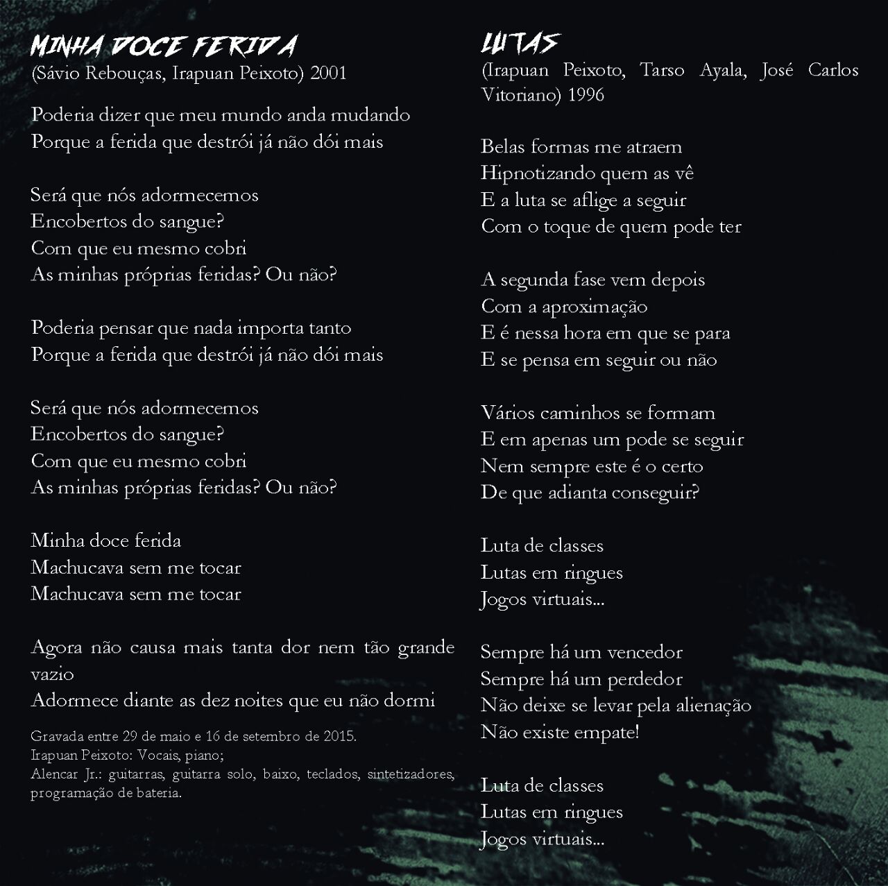 Outra canção da época da Jeannie Gen, esta é a parceria que mais gosto das que escrevi com Sávio Rebouças, o guitarrista do grupo. Ainda tenho vívida a memória de quando a canção nasceu, durante um ensaio em que os outros caras tiveram que sair mais cedo e eu e Sávio ficamos para escrever alguma coisa. Minha doce ferida nasceu ali, numa casa de praia, com guitarra e teclado lado a lado e o pôr do sol ao fundo. Sempre fui muito orgulhoso dela porque é mais elaborada do ponto de vista harmônico e melódico, o que foi proposital. Também foi uma das poucas canções que escrevi com o Sávio que não nasceram de uma jam session, mas de um esforço orientado. Minha doce ferida chegou a ser gravada pela Jeannie Gen, no EP produzido por Moisés Veloso, em 2002, mas gosto mais da versão atual, onde pude pôr em prática ideias que já tinha para ela, inclusive, o arranjo de piano.
