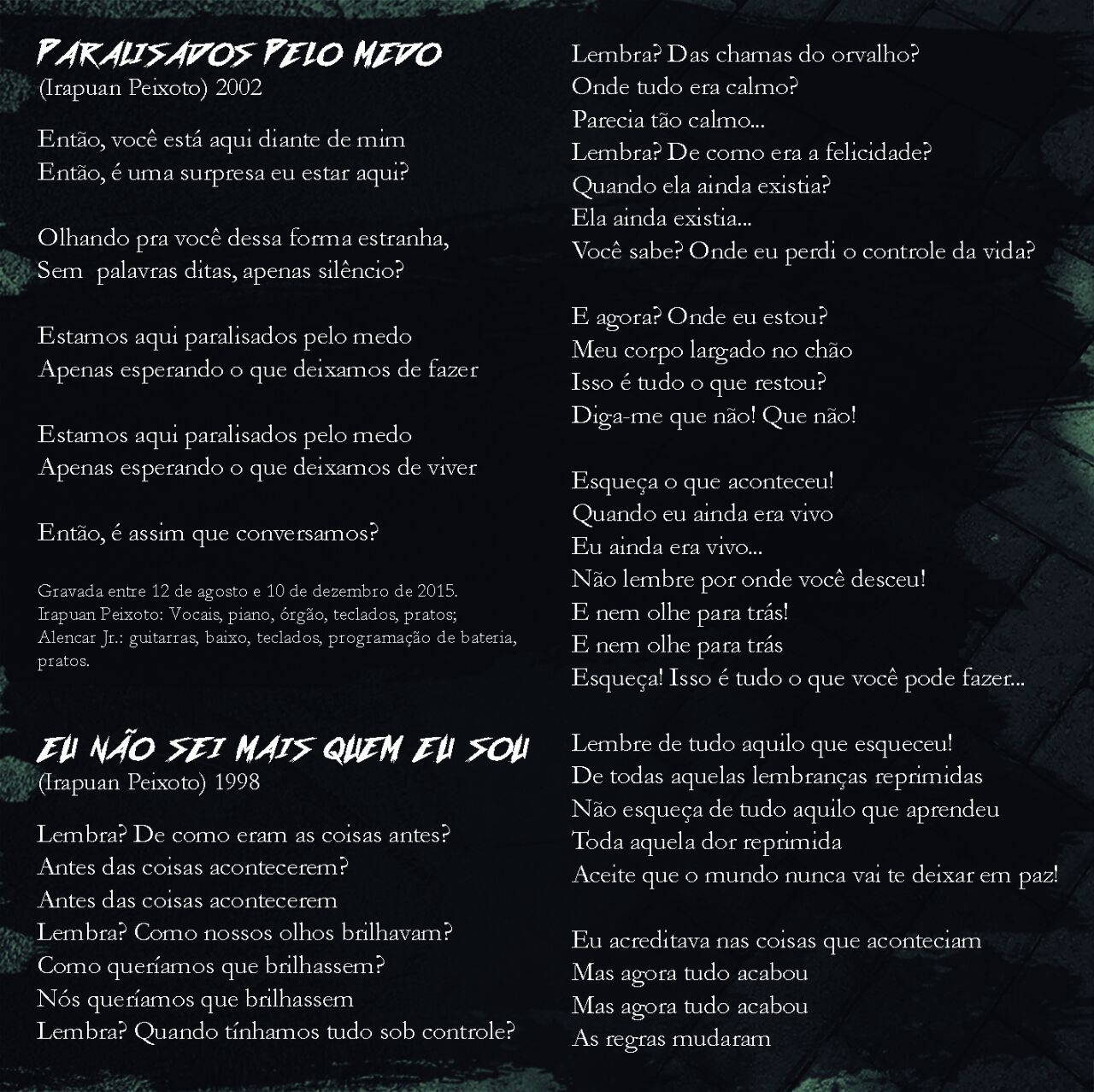Uma das mais reflexivas letras que já compus, a ideia básica dela me veio durante o banho. A música veio primeiro e compus a melodia no piano. A letra veio em seguida, falando de uma temática muito cara à maioria das pessoas: a falsa ilusão de que o passado foi melhor do que é o presente. Uma vez pronta, esta canção sempre me remeteu à melancolia do Roger Waters na obra do Pink Floyd nos anos 1970. Anos depois de escrita, “converti” Eu não sei mais quem eu sou em uma canção de violão, com uma pegada de Neil Young (que tinha até uma gaita). Para a gravação, optei por uma mescla das duas.