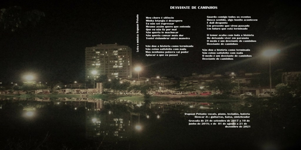 É a composição mais jovem do EP, criada pouco antes das gravações, refletindo os meus estudos em Sociologia Urbana, especialmente sobre os usos dos espaços nas cidades e a mobilidade urbana. A estrutura dos versos e do refrão é inspirada no estilo folk, com alguma elegância. A gravação dela foi um pouco trabalhosa, porque tínhamos duas abordagens distintas: uma roupagem mais folk, mais calma, com gaita; contudo, minha gravação da bateria elevou a potência e a encaminhou para algo mais enérgico, ainda mais quando Alencar adicionou as guitarras de ritmo. O peso dos instrumentos fez com que gaita e pandeiro tivessem que sair. Chega a ser uma pena, porque a gaita dava um tom legal, mas quem sabe, resgatamos isso no futuro?