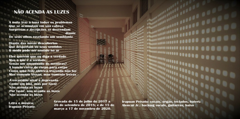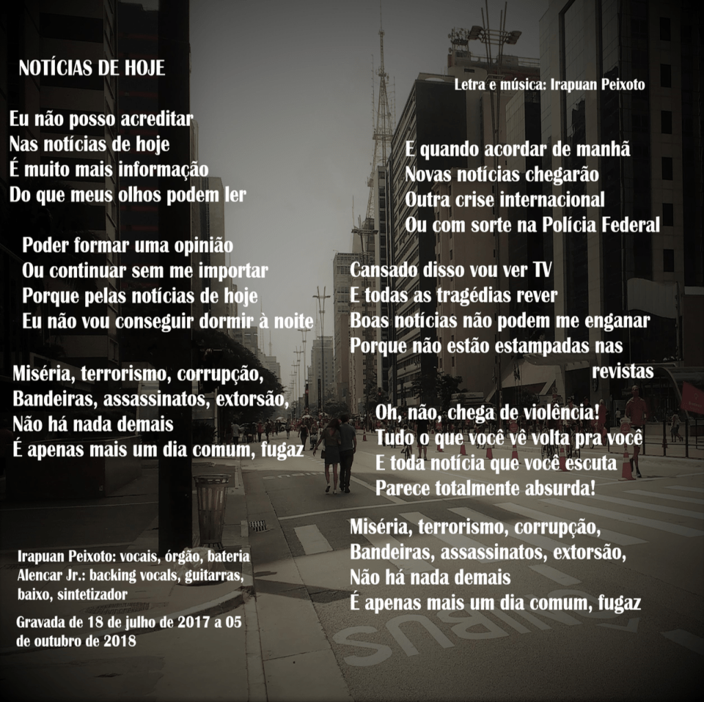 Esta canção não é nova, mas sua letra continua funcionando, o que é um mau sinal para o Brasil. O fato de ser sociólogo me impeliu a escrever letras com críticas sociais de vez em quando e o fiz nesta. Embora tenha sido escrita num teclado, sempre foi pensada como uma faixa de guitarra na linha punk-hardcore. O uso de passagens simples nos acordes dos versos é proposital para criar tensão com a mudança seguinte, na qual a harmonia flutua em limites tênues em acordes mais elaborados. Inspirado no rock clássico decidi experimentar a estrutura verso, refrão, verso, meio, refrão; algo que não é muito comum nas minhas composições.